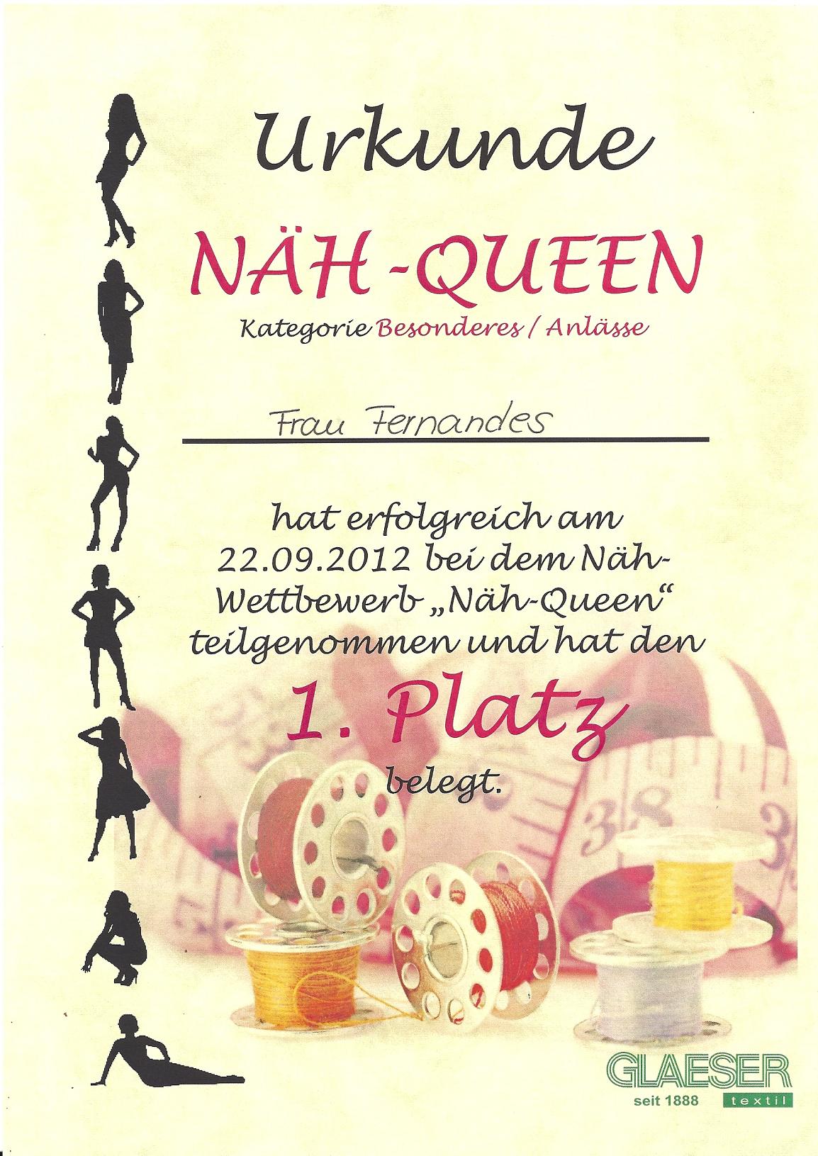 Bei dem Näh-Queen Wettbewerb habe ich am 22.09.2012 mit meinem selbst entworfenen und genähten Dirndl teilgenommen und den ersten Platz belegt.